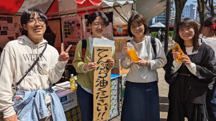 同校では日頃より、学校内外から廃食油を回収してワーカーズコープ・あぐりーんの協力のもとバイオディーゼル燃料(BDF)に精製し、体育祭や文化祭の発電、送迎バスの燃料として活用しています。アースデイ東京2025」では会場発電にこのBDFを使用すること等で昨年度比62.5%の化石(ガソリン)燃料発電機利用削減につながりました。