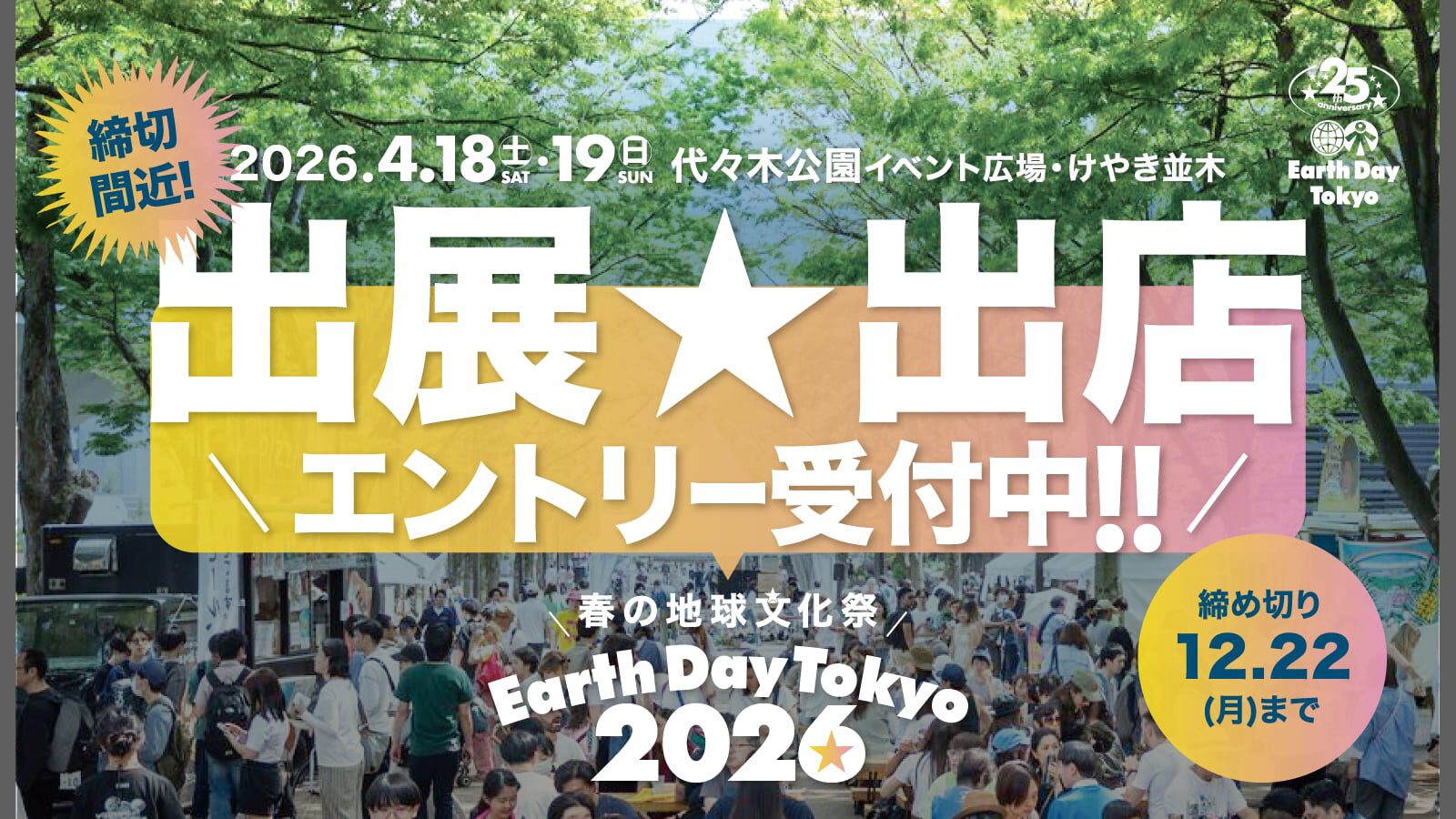 2026年はアースデイ東京がはじまって25周年!2050年までの新たな25年を目指し、これまで以上にアースデイを盛り上げるために、例年より早く10月22日より、出展・出店希望者のエントリーを開始しました!