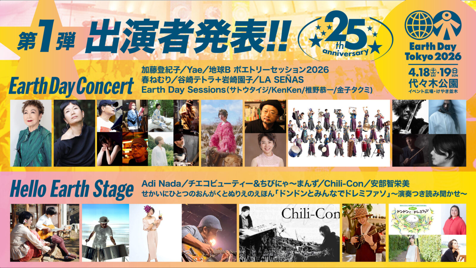 日本最大級の市民フェスティバル「アースデイ東京 2026」が、2026年4月18日(土)・19日(日)の2日間、代々木公園にて開催されます。開催に先立ち、記念すべき25周年のステージを彩る第1弾出演アーティストが公開されました。